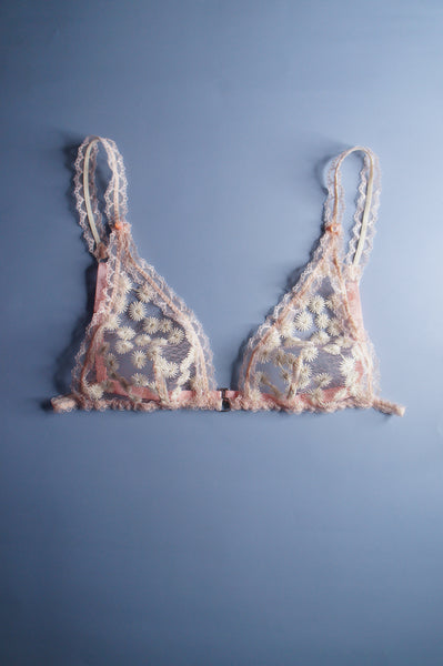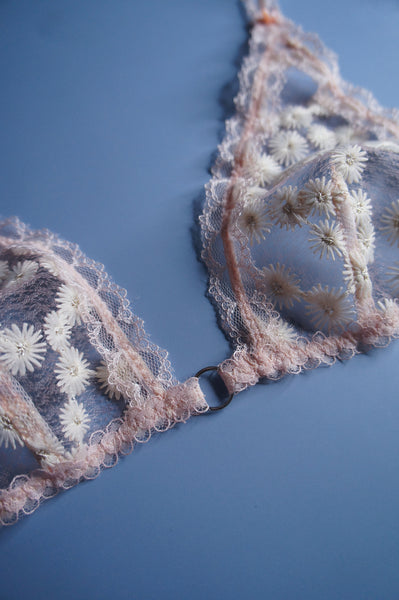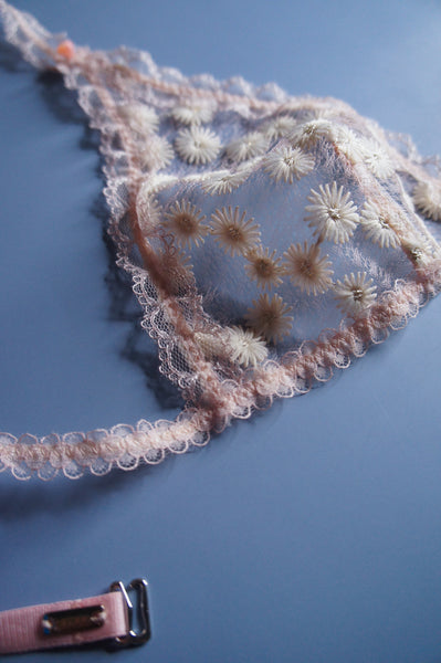 When I saw this fabric in Japan I knew, I felt (!), I had to make lingerie with this. The embroidery floats on the sheer tulle like dandelions floating away in a field. Pay attention to the trimming, the straps and the framing are two different kinds of lace trims, both picked to match the embroidered fabric. Tiny pink recycled buttons add a little extra touch of continuity to the straps. A ring detail at the center and adjustable grosgrain strapping at the back make this fit and feel as light as a whisper. Peek those details up close, you'll appreciate it more and more every time you look at it.