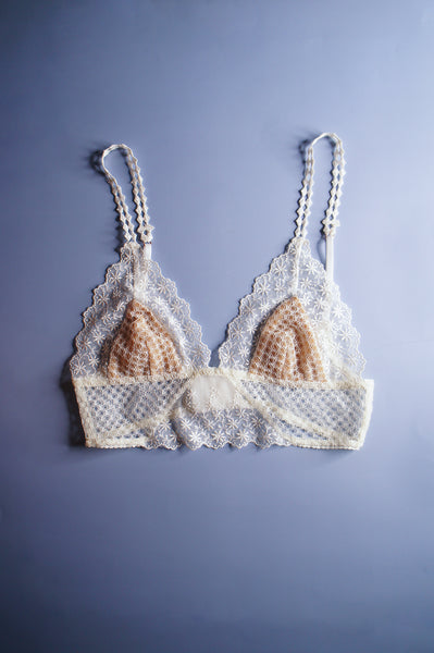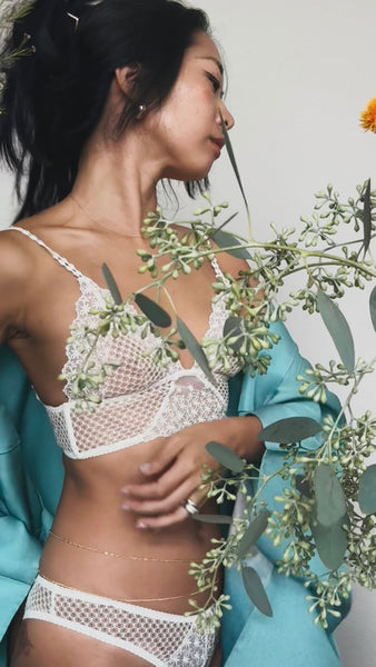 Details. Details. Details. This set is all about them. From the honeycomb mesh inspired by Japanese bamboo weaving, the embroidered lace, the double-row diamond trim straps. Showing your bra straps have never felt more elegant and feminine. The scoop back feels balletic, stretch mesh make the fit of this one light and breathable. I always try to achieve styles that feel like you're wearing nothing. A little side boning keeps the structure, and lined cups give the coverage you need if you want it. If you don't want it and prefer sheer cups, just leave me a request "no lining" at checkout.